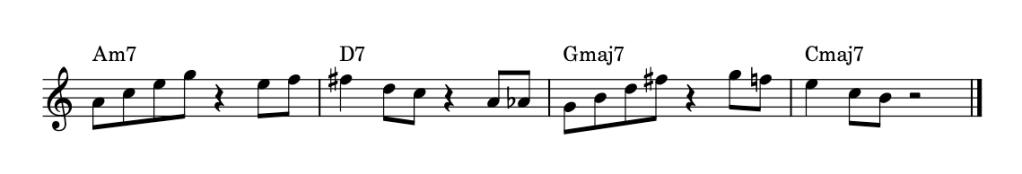 After we’re comfortable with this idea, then we add another eighth note that is a chord tone to have a consonant sound, that sets up the tension and release.
